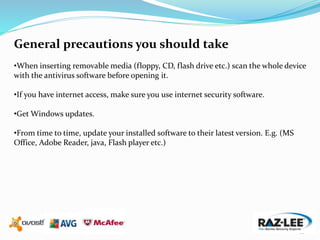 Use antivirus to protect your computer. What is antivirus software? Antivirus software is nothing but a computer program. Its job is to protect your computer by detecting any viruses and preventing them from harming your computer. It takes action to remove these viruses which are malicious software programs.