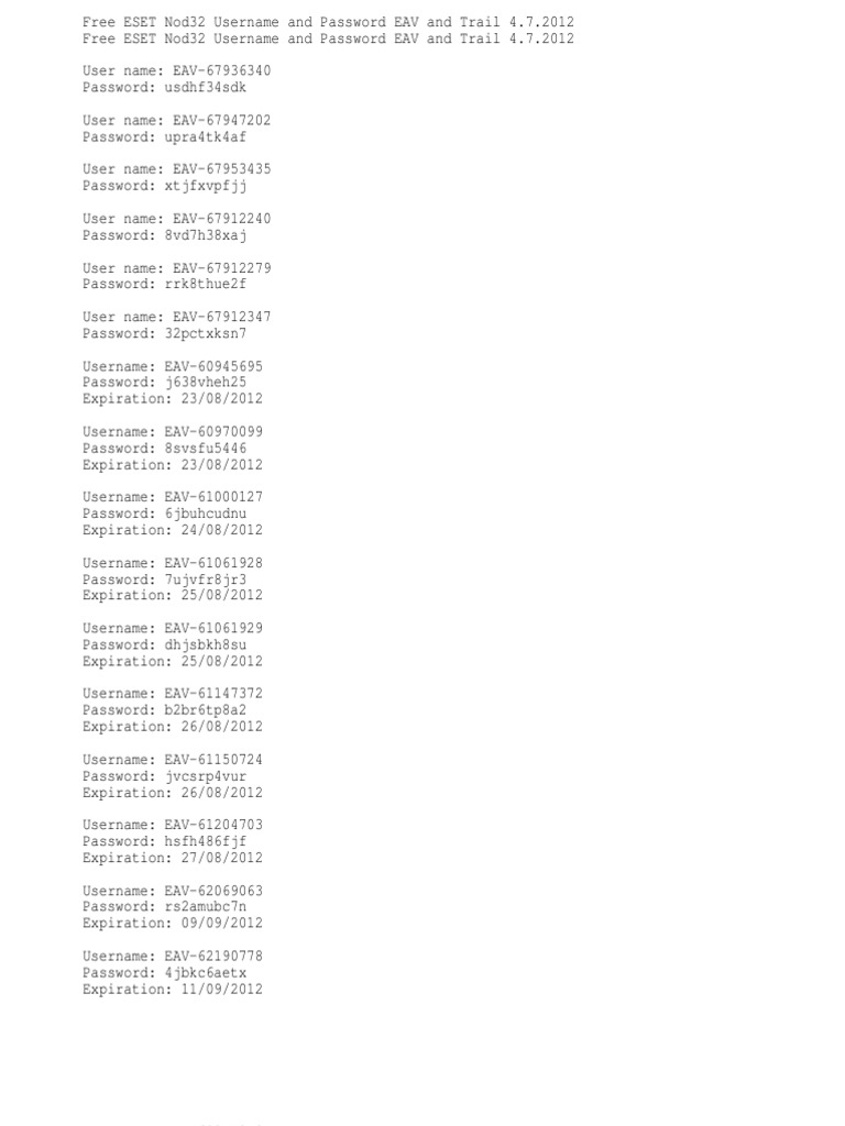 eset nod32 antivirus 4.0.417.0 username and password on ... The file must be password protected with a password of "infected".. Eset nod32 antivirus 4.0.417.0 username and password. Nod32 antivirus 4 for linux desktop, registeredprehensive help and support for eset nod32 antivirus.. ESET 32 Antivirus ESET NOD32 Smart Security 30 ( 16 2016). Invalid Username and/or Password - ESET NOD32 Antivirus ... Good day all! I recently installed Linux Mint 19.3 on my laptop, and have now installed ESET NOD32 Antivirus 4. The installation appears to have gone well enough. However, the program is telling me that I have provided it an "Invalid Username and/or Password." In looking at the original e-mail fr... password and nod32 username Eset pefelie [BIG7H1] Search: Eset nod32 username and password pefelie. About Eset and pefelie username password nod32 ESET NOD32 Antivirus 10 License Key 2020 Username Password ... 11. 14. George Dawon on ESET NOD32 Antivirus 10 License Key 2020 Username Password. · Free Eset nod32 license key Here's Free Eset Nod32 Eset nod32 license key for 2020 2021 2022 Eset nod32 Username Password: Username : TRIAL-0260544543 Password : k2ns9r74np - Valid until August 04, 2021 Username : TRIAL-0260528744 Password :. 2020. 8.