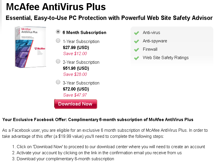 McAfee AntiVirus Plus Free License Key For Six Months ... McAfee would be the only commercial anti-virus vendor offering frequent 6 and 12 months free licenses giveaways for their products, the good news is that they are back with a new promotion for Facebook members giving away six month subscription for their "McAfee AntiVirus Plus" product.