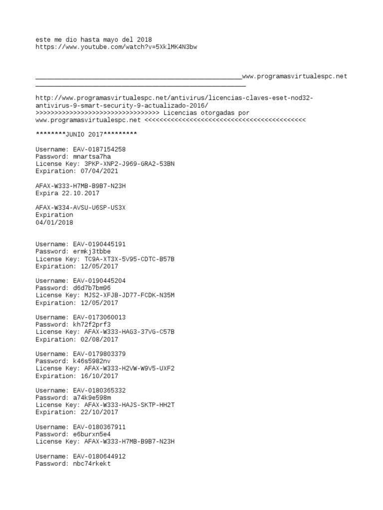 Crack Serials - Eset Nod32 Username and password 2017 Eset ... Eset NOD32 8 Anrivirus License Keys, Eset NOD32 Serial Key, Eset NOD32 7 & 8 Trial Username & Password Copas serial number di bawah ini ke ESET NOD32 ANTIVIRUS versi 4 atau 5. Username: EAV-54108373 Password: sm6rr8rmdj Expiry Date: 29.04.2017, Username: EAV-51526916 Password: kpvr48kr5n Expiry Date: 13.03.2017. Eset Nod32 8 & 9 Ver Antivirus software - Wikipedia Antivirus software, or antivirus software (abbreviated to AV software), also known as anti-malware, is a computer program used to prevent, detect, and remove malware.. Antivirus software was originally developed to detect and remove computer viruses, hence the name.However, with the proliferation of other malware, antivirus software started to protect … Serial number driver update license key Driver Booster 9 Pro License Key Giveaway: 12. Driver Booster 9.1 license key: 13. Driver Genius Professional Edition 10 (After Update) 14. Driver Booster 8.7 License Codes: 15. Update my driver small tweak: 16. Cakewalk SONAR Update for Sonar v1.0 v1.02 Update for Sonar v1.0: 17. NOD32 IDs Update ThreatSense Update:v.4493 (20091009) 18. Eset Nod32 Antivirus 8 License Key * For Free - Bitbucket Eset NOD32 keys version 8/9/10 username and password, latest license serial key for nod32 antivirus eset internet smart security premium 2018/2017 pc and mobile phones free activation, health for your pc and relax for your reckless mind .pefelie.net.
