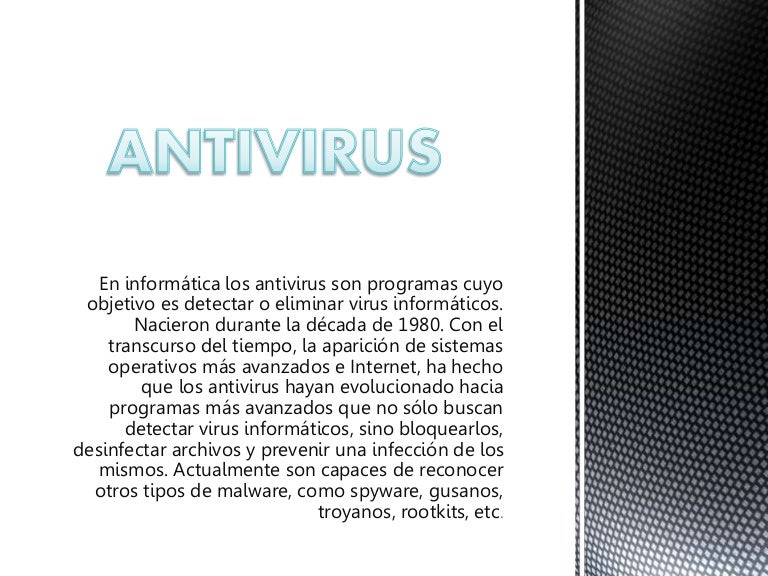 Define Antivirus Software and Its Types | Antivirus Definition Antivirus software is a type of program designed and developed to protect computers from malware like viruses, computer worms, spyware, botnets, rootkits, keyloggers and such. Antivirus programs function to scan, detect and remove viruses from your computer. There are many versions and types of anti-virus programs that are on the market. Antivirus software - Wikipedia Antivirus software (abbreviated to AV software ), also known as anti-malware, is a computer program used to prevent, detect, and remove malware . Antivirus software was originally developed to detect and remove computer viruses, hence the name. What is antivirus and why is it important? - FIT Information Technology Anti-virus software examines every file and piece of software that tries to install or execute on your computer and determines if it's malicious. It does this in 2 ways. Signature-based: This is the most common method. Anti-virus companies are constantly publishing lists of known malware as reported across the Internet.