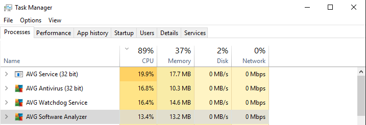 100% Disk Usage From Antivirus - Troubleshooting - Linus Tech Tips FurryZx. Member. 81. 2. Posted October 5, 2016. On 10/5/2016 at 3:57 PM, SherifsDog22 said: Its a bug with windows I'm pretty sure, I've had the same problems with Windows Defender on SSD's and HDD's, I don't think the report for the r/w speeds is entirely accurate. do you mean as the r/w speed for the task, or taskmgr.exe. How to Fix High (100%) CPU Usage in Windows | AVG Step 1: Right-click on your taskbar and select Task Manager. Step 2: With the Task Manager open, switch to the Processes tab and click on the CPU column to sort by CPU usage. Viewing CPU usage in Windows Task Manager. If you're unfamiliar with the app that's causing high CPU usage in Windows 10, look it up online. How to Fix 100% Disk Usage in Windows 10 | AVG Right-click on the taskbar and select Task Manager. On the main dashboard, click on the Disk column to see all running processes sorted by disk usage. Make sure the arrow in the Disk column is pointing down. That way, you'll see the processes with the highest disk usage first. Install AVG on your PC, Mac | AVG installation files - AVG.com AVG AntiVirus for Android; AVG Cleaner for Android; AVG Secure VPN for Android; AVG Secure Browser for Android; AVG Mobile Security for iPhone/iPad; ... AVG installation files. Install our award-winning products. PERSONAL. BUSINESS. AVG AntiVirus FREE. Effortless protection for your PC, absolutely free. Learn more.