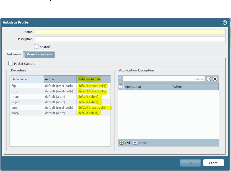 Antivirus Profile Decoder Wildfire Actions - Palo Alto Networks The WildFire action setting in Antivirus profile blocks viruses the WildFire identifies in content signature updates in the Antivirus profile. This BPA check ensures the decoders are set to reset-both, drop, reset-client, or reset-server in the WildFire Action column. If users have a WildFire subs...