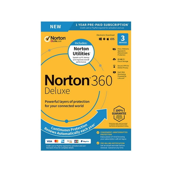 Norton 360 Deluxe | Sécurité avancée et protection antivirus pour 5 ... Aidez à protéger toute la famille grâce à la protection antivirus et antimalware pour 5 PC, Mac ou appareils Android ou iOS, ainsi que le contrôle parental, ... Norton 360 Deluxe |5 Users 1 Year|Total Security for PC, Mac ... Comes With Advanced Anti-virus, Anti-Spyware, Anti-Malware & Ransomware Protection Powered By Innovative Security Technology. INCLUDES - Secure VPN With Bank- ...
