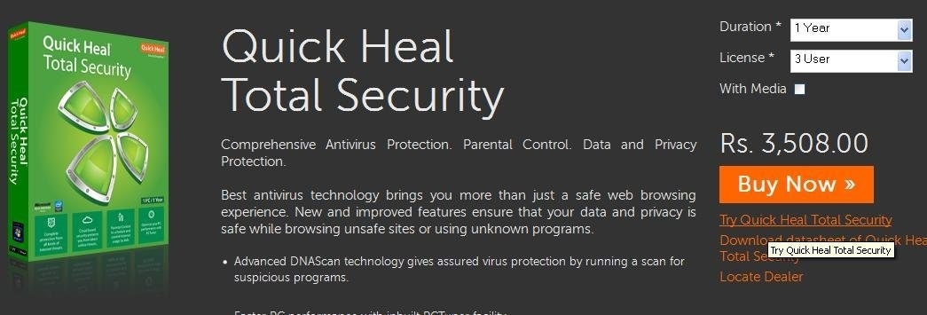 › Quick-Heal-Total-Security-VersionQuick Heal Total Security Latest Version - 1 PC, 1 Year (DVD) I have been using quick heal for the last 5 years and can stay this is the best antivirus as I a tech enthusiast and have tested almost all antivirus on this earth and found that no one can match the performance and virus detecting capabilities of this antivirus.You will find that it will solve the majority of the problems on your laptop/ Pc.