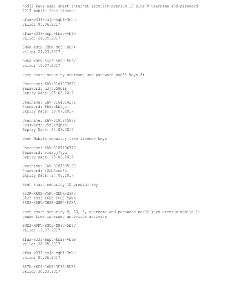 Eset nod32 antivirus 9 license keys. ESET License Keys: Antivirus, Internet, Smart Security Oct 14, 2019 · FSX6-X7SD-5J67-4F32-P8TB ** Don’t try any keygen that is available online. It won’t work. Working keys for any version from undisclosed owners. Try these if it will work: 6MAP-XNCN-UPW6-9JGK-BMJX HXWP-X9UX-SBV5-MEK4-45MP 62SX-X2MC-WWFF-ERVX-VPR8 VCWA-XSBA-CE7V-F4BK-8C5A 3PP6-X242-6PTT-23UH-TFR4 HBUX-X53B-DFV5-R5BP-9CFK DJMH-X2B5-WKPS-6UFK-NGGG Eset Nod32 Antivirus 9 Serial Keys [d47evmjzpdn2] Eset Nod32 Antivirus 9 Serial Keys. Uploaded by: Indra Brc. September 2022. PDF. Bookmark. Download. This document was uploaded by user and they confirmed that they have the permission to share it. If you are author or own the copyright of this book, please report to us by using this DMCA report form. Report DMCA. ESET NOD32 and SmartSecurity Licenses - Free Updated Keys 2023 License Keys for ESET NOD32 Activation keys ESET Smart Security Activation keys for Smart Security BTYV-MSYT-QZIP-LVOG-FILM KAOR-4G33-N5ET-L4G3-61DO 1UWC-GFJI-1WC1-7KVU-Y6P2 3DPG-W6M3-VMVH-Z94H-S0PG AMVL-HJPT-UBK8-RBIJ-T3TT O6UP-DHM5-OC9F-MKXM-FR2Z 0O2K-OL8N-IIKA-MMVZ-EAW5 I8OC-MYY5-RKK0-AGZ1-QQK4 LUPX-VZUO-RDXX-WYKV-PRUL 5H4A-XVQ6-G5C7-AIZH-CTT7