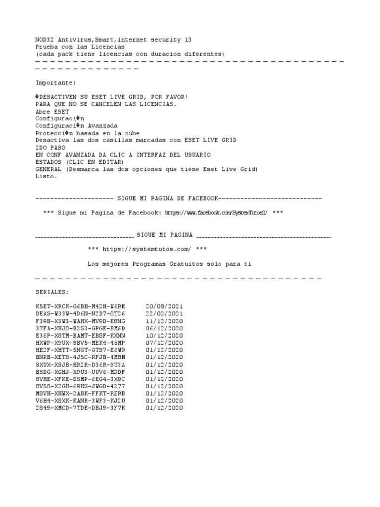 Antivirus NOD32 Licencia, Serial y llaves 2021 Keys - Facebook Licencias ESET NOD32 incluye versión 11, 12 ,13 para DICIEMBRE 2020. (parte 1) compartan e inviten a mas usuarios a sumarse a esta pagina con licencias... CLAVES, LICENCIA Y SERIALES ORIGINAL PARA ESET NOD32 ... ... nod32 antivirus 9 licencia gratis eset smart security 9 licencia 2020 ... nod 32 antivirus 12 seriales eset nod32 2021 seriales eset nod 32 febrero 2020 ...